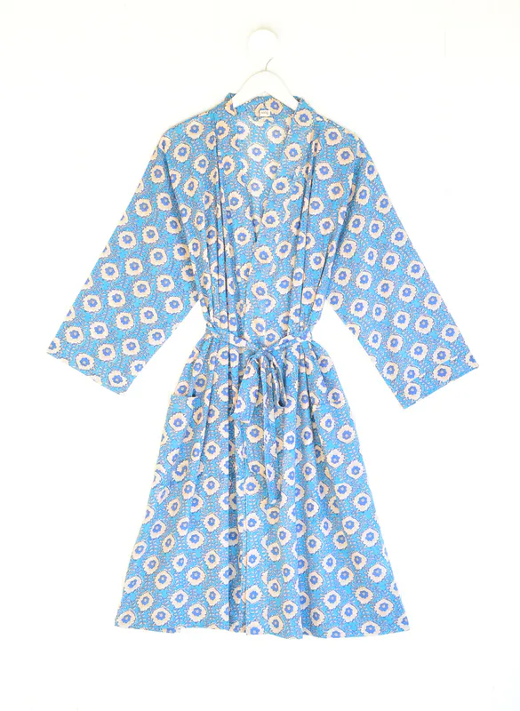 description: soft cotton calf length loose cut robe with separate belt and front pockets